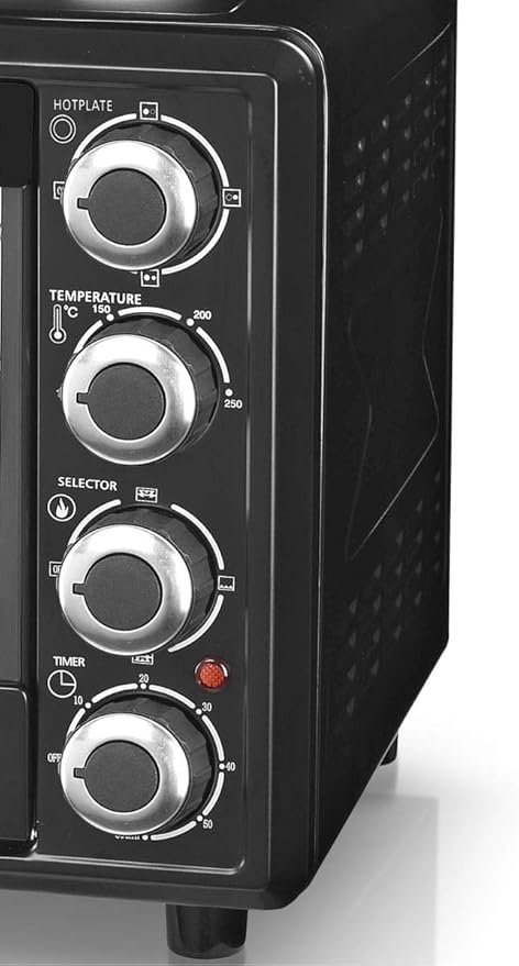 With a generous 30-liter oven capacity, it is ideal for preparing family meals, baking cakes, grilling chicken, or roasting meats. The two hot plates on top provide additional convenience for cooking sauces, boiling, or frying, making it a perfect choice for compact kitchens or small households.